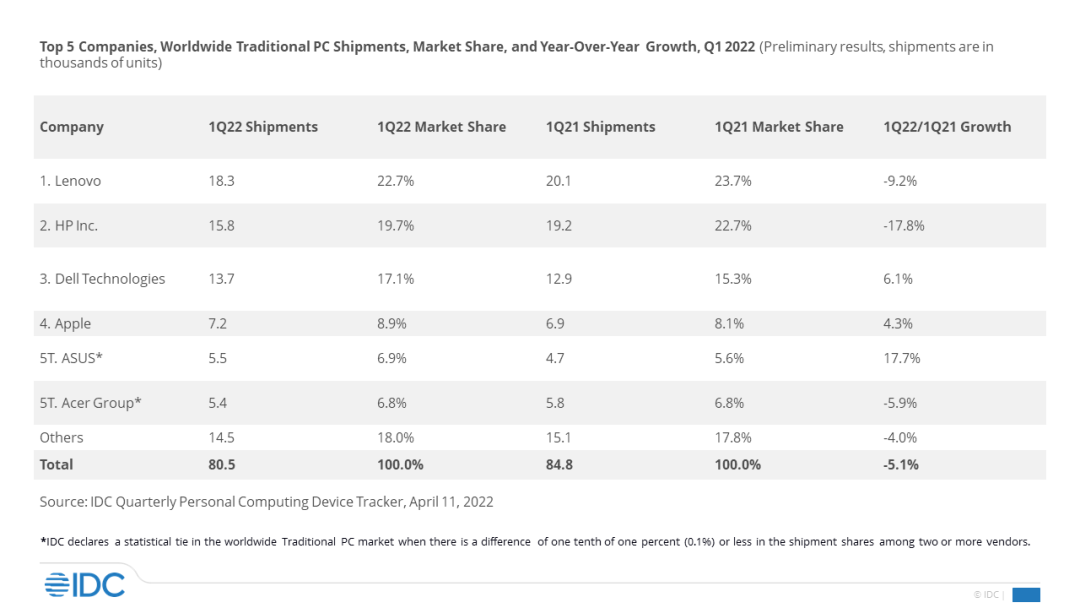 与2021年的第四季度相比,市场前五大供应商的排名在2022年第一季度中保持不变。联想仍然以22.7%的市场份额位居榜首,紧随其后的是惠普、戴尔和苹果,华硕和宏碁在2022年第一季度中并列第五。戴尔、苹果和华硕是仅有的出货量同比增长的Top级供应商。由于持续的供应链短缺以及与强劲的第一季度相比的挑战性,笔记本电脑同比下降,而台式电脑略有增长。