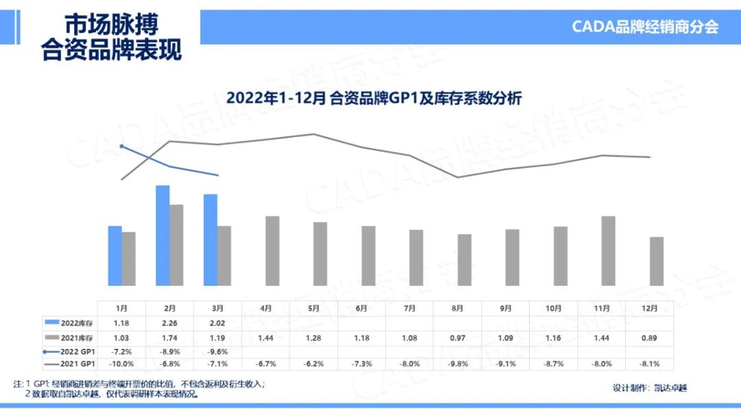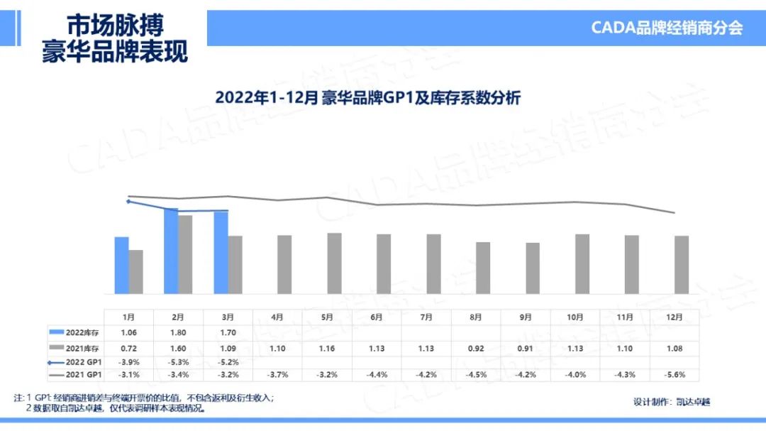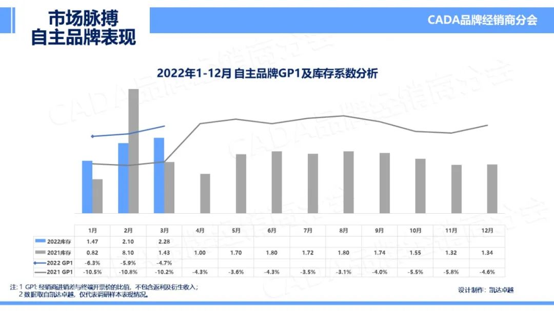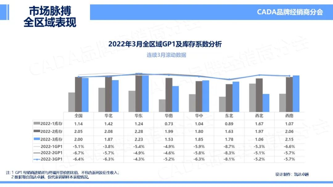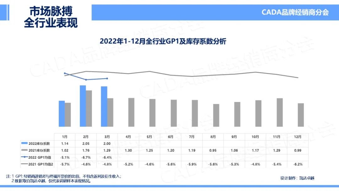 2022年3月,受疫情反复影响下,各地仍未完全恢复常规的生产生活状况,在减少聚集、减少非必要外出等政策倡导下,部分城市管控严密,也有地区尝试AB班人员上岗,各地销售能力均有所减弱。因此在受春节长假影响的2月之后,库存系数仍未得到有效降低,为2.0。但受芯片、进口零配件供给不足的持续影响下,GP1环比有所上涨,在本月全国平均水平达到-6.4%,但仍未超越去年同期值。
