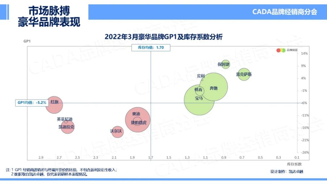 2022年3月,豪华车市场GP1稳中微升至-5.2%,库存系数略降至1.70,主要是由于疫情持续反复导致的销售能力减弱,经销商实际库存总量保持稳定。豪华车市场由于进口零配件生产及物流影响,国内目前仍持续表现出供应不足的状况。关注市场脉搏,保持稳定的销售节奏,目前为各经销商最重要的工作之一。