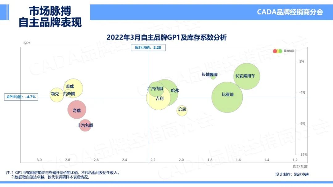 2022年3月,自主品牌中GP1提升最优的三个品牌为:长安乘用车、上汽荣威、长城魏牌;库存系数3月降低幅度最大的三个品牌为:启辰、长城魏牌、长安乘用车。