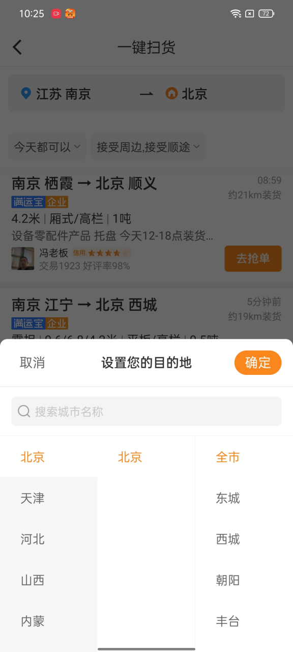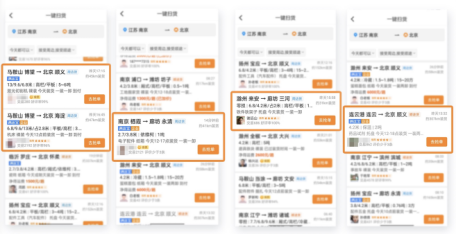 以南京-北京为例,通过“一键扫货”功能,司机能额外看到南京周边到北京、南京到北京周边、南京周边到北京周边、南京出发到连云港装货送往北京的货源