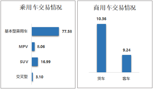 2022 年 1-3 月,基本型乘用车共交易 230.73 万辆,同比下降 3.89%;SUV 共交易 49.42 万辆,同比增长 17.26%;MPV 共交易 22.95 万辆,同比增长 0.79%;交叉型乘用车共交易 8.81 万辆,同比下降 0.54%。