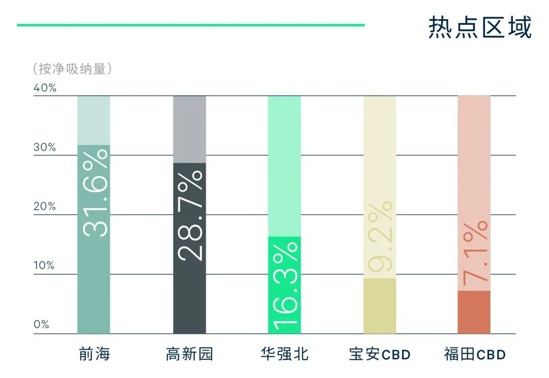 本季前海以及高新园片区表现优异,二者共为市场贡献了60.3%的净吸纳量。着眼租赁类型,搬迁类需求居市场主导,占比约7成,主要来自科技、非金融类企业从产业办公楼以及乙级以下的写字楼搬迁至优质写字楼。