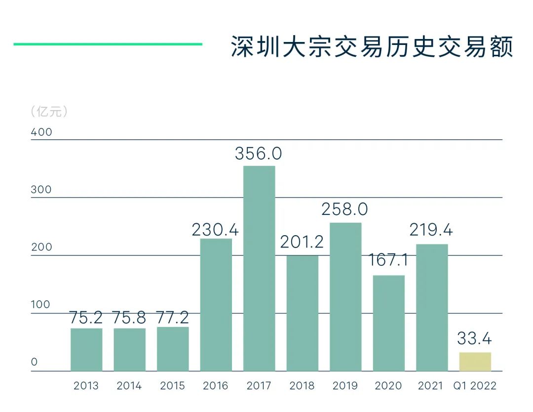 2022年第一季度,深圳大宗交易市场保持了一定的活跃度,共录得5宗大宗交易,包括4宗写字楼交易以及1宗数据中心的交易。单季成交总额共人民币33.4亿元,环比和同比均有所下降。