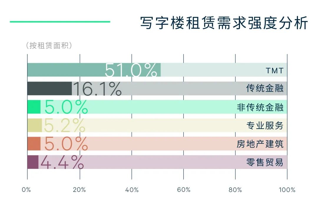 聚焦新租赁需求,科技板块继续独扛大旗,为市场贡献了超5成的新增需求,细分主要来自于科技互联网板块的软硬件开发。本季录得两宗上万平方米的国内头部科技企业的扩张需求,其中一宗达3万平方米。金融类板块需求占比在本季达21.1%,位列第二大需求,主要来自传统金融企业的扩张,大面积成交聚焦银行、保险两大类子板块。专业服务和房地产建筑并列市场第三大需求,占比均约5%。