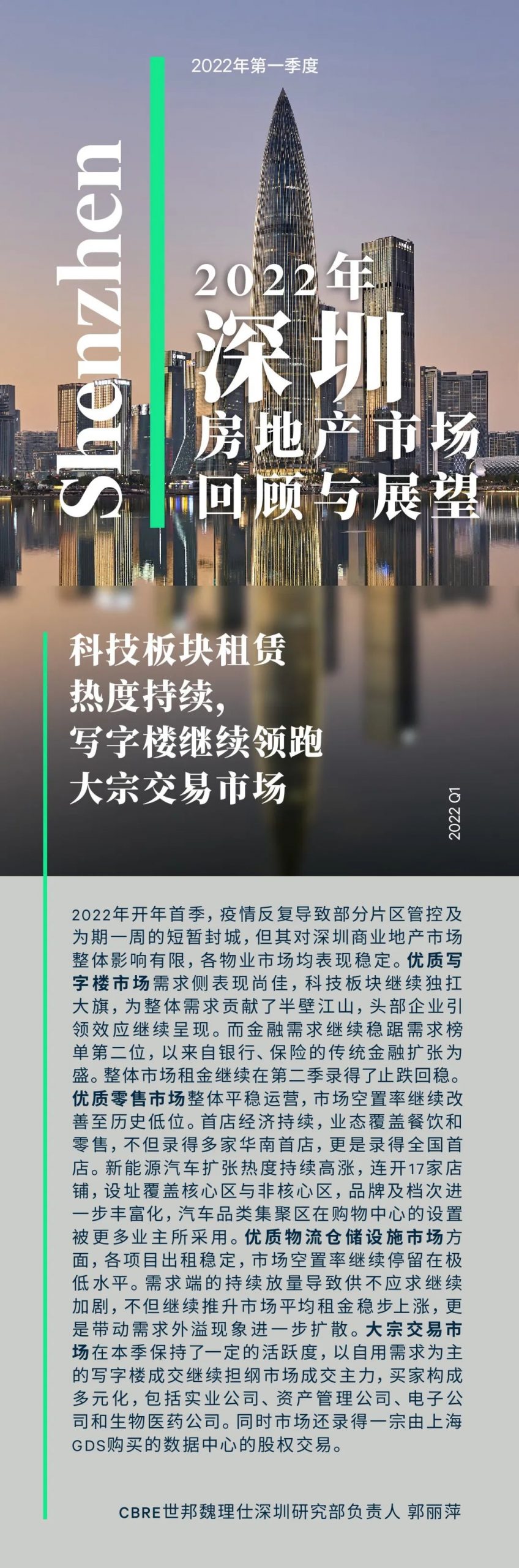 2022年第一季度,深圳高位供应依然持续,四个甲级写字楼超30万平方米的新增供应于春节前交付使用,主要分布在前海和后海两大片区。