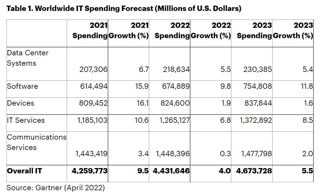 根据Gartner的最新预测,2022年全球IT支出预计将达到4.4万亿美元,比2021年增长4%。