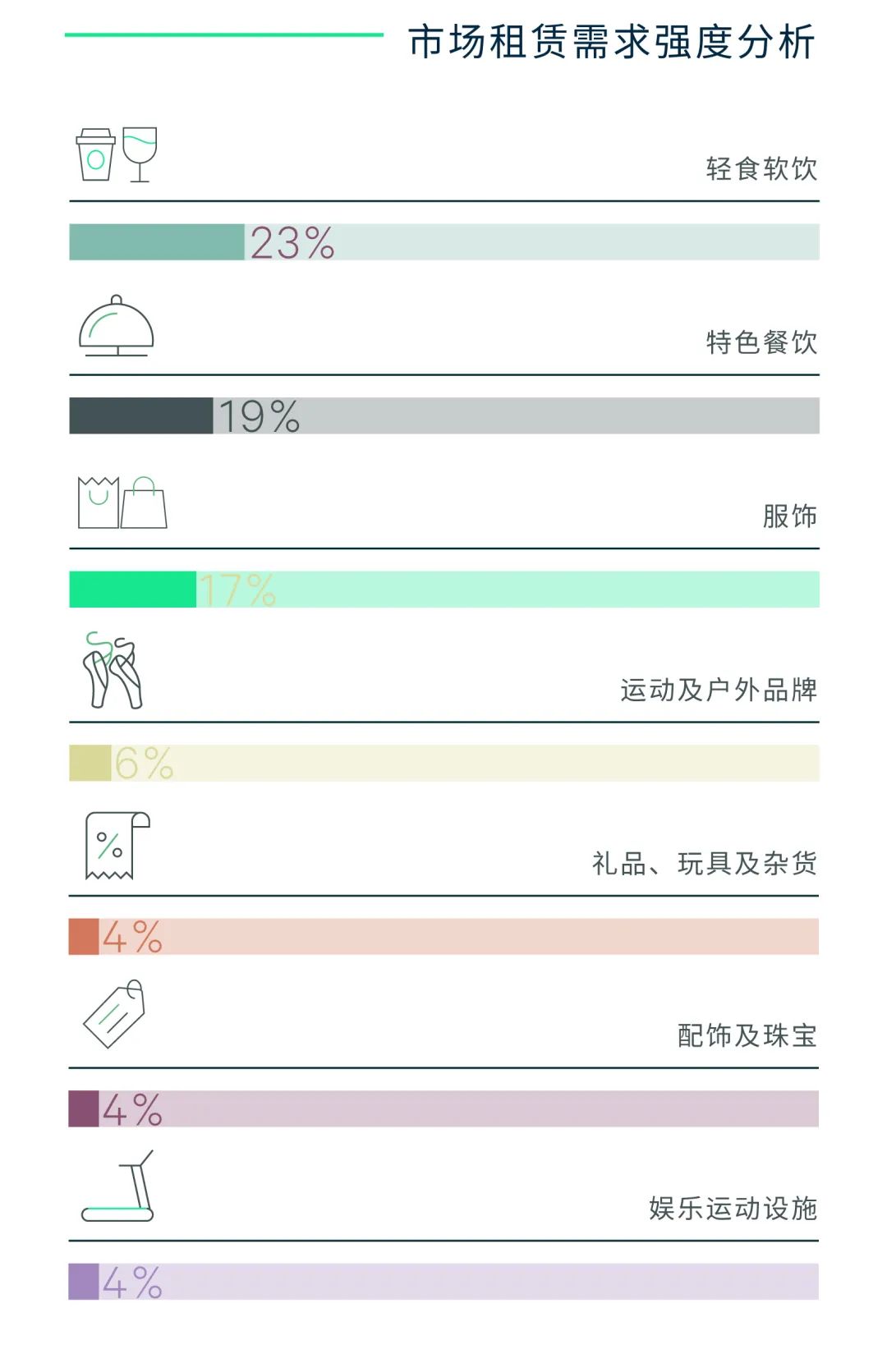 餐饮业表现依然突出,在重点监测的商场中,47.8%的新增租户都是餐饮品牌。特别是以咖啡和中式甜点为代表的轻食软饮占比多达23.0%,一方面因为部分相关品牌获得融资,得以进行门店扩张;另一方面,不少业主把大餐饮或主力租户铺位调改为多个小餐饮铺位,增加了这些零售商进入优质购物中心的机会。而在零售业态方面,服装品牌新店开业占比17.4%,其中潮牌Madness首进广州。而在其他体验类业态方面,教育类业态出现退租现象,主要是学科类教育租户,而素质类教育机构,如机器人、编程和音乐培训等租户,仍录有新租。另外,运动和娱乐业态方面,本季录得太极和泰拳柔术等区别于以往的健身类新门店。租金方面,全市首层租金保持大体平稳,季内无涨跌,季末租金为每天每平方米28.2元。