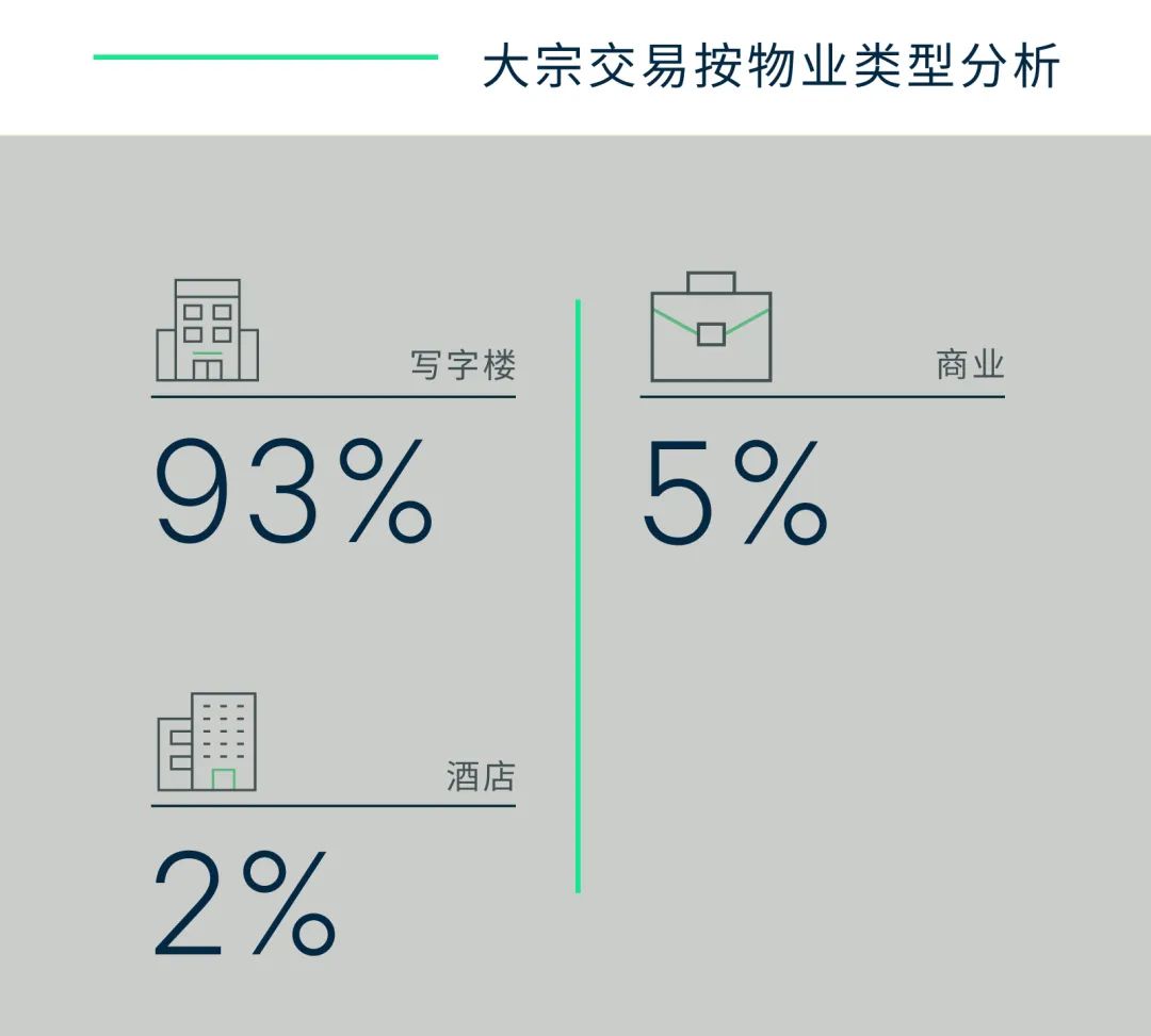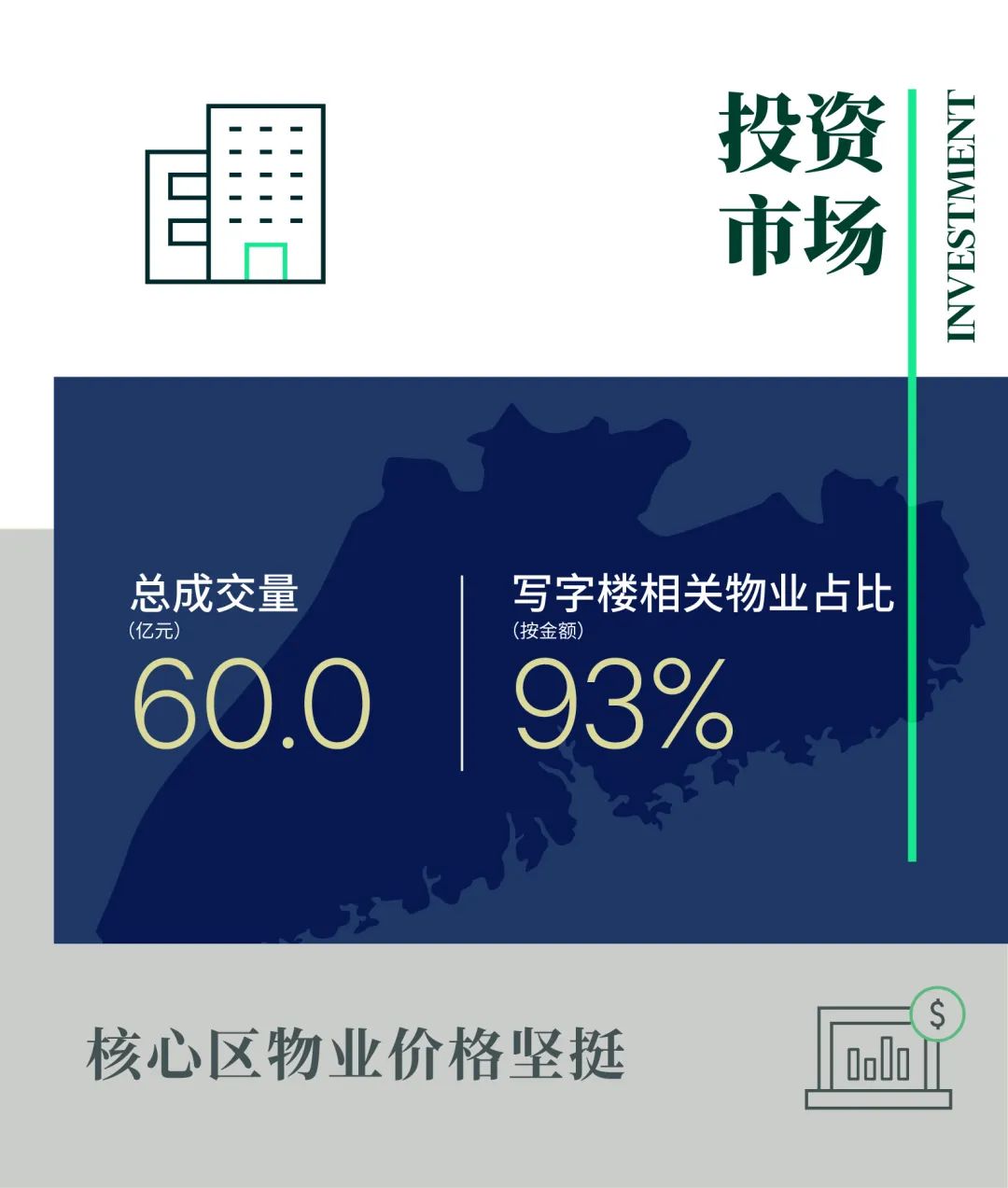 广州本季度共录得五单大宗投资成交,总成交金额近60亿元人民币,环比增长约20%,超过了2021年上半年的成交金额。其中超过九成的成交金额来自两宗写字楼成交,均位于主要商务区域,投资者抓住了核心区域的写字楼交易机会,投资于广州市场。另外,海印集团于本季度以约九千万元的金额出售持有的番禺总统大酒店,而一家本地开发商,则在本季度成功处置了一个位于番禺的社区型商业项目。