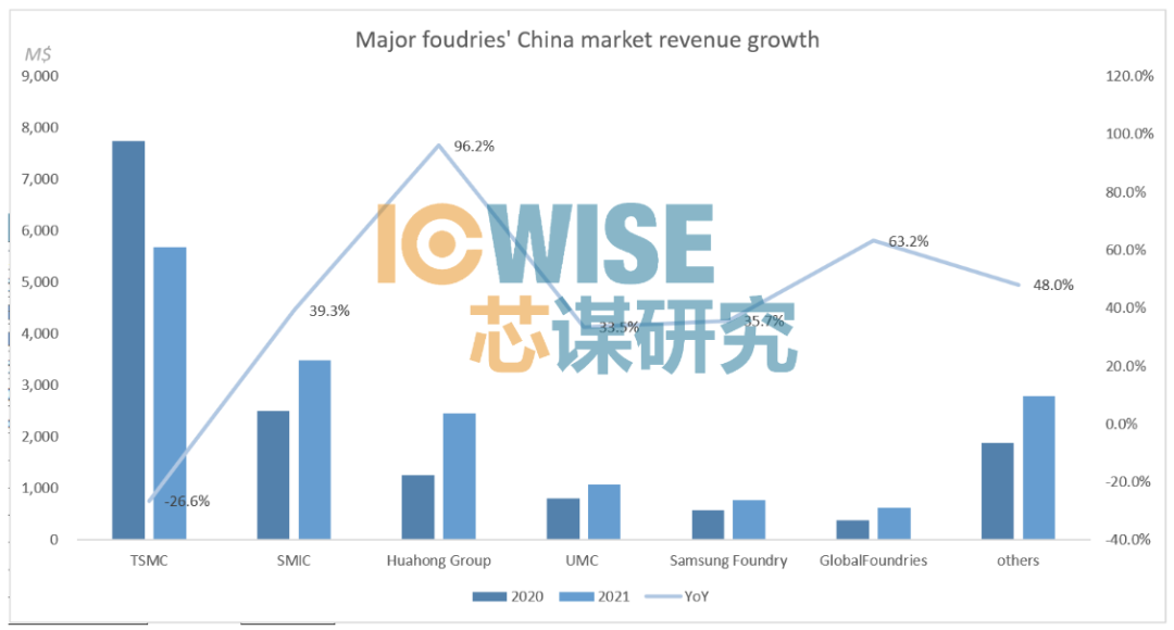 晶圆需求旺盛,代工支出增长。芯片设计产业的发展离不开晶圆制造的支持。根据芯谋研究的调研统计,2021 年,中国芯片设计企业的晶圆采购金额相比 2020 年增长了 11.56%,中国晶圆代工市场的总规模达到 168.78 亿美元。全球主要晶圆代工厂中,除台积电外其他公司的中国市场营收均大幅增长。台积电因不能服务特定公司,2021 年中国市场营收出现下滑。