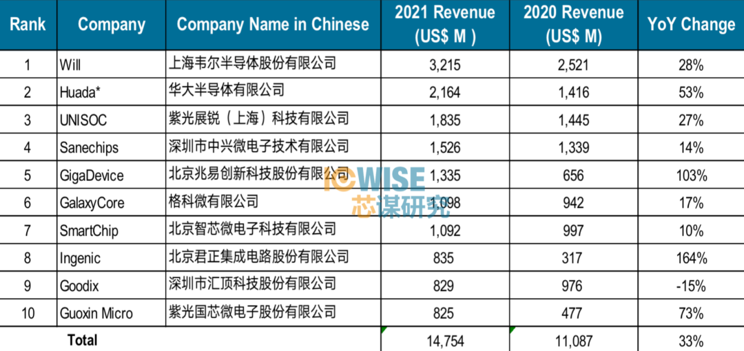 注(*): 华大芯片设计业务营收数据为华大旗下所有芯片设计业务营收总和,数据来源:芯谋研究