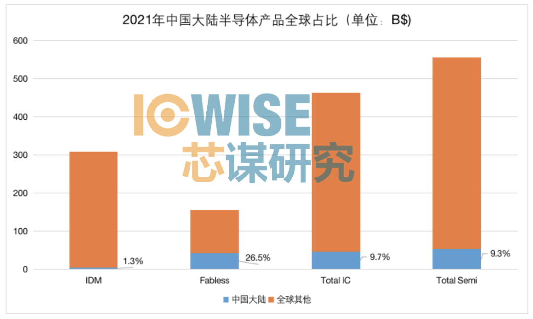 2021 年中国大陆集成电路设计产值为 448.32 亿美元,其中 Fabless 公司的产值是 409.19 亿美元,占全球 Fabless 的比例为 26.5%;IDM 的产值是 39.13 亿美元,占全球 IDM 的比例为 1.3%;集成电路的总产值为 448.32 亿美元,占全球比例为 9.7%;加上分立元器件中国半导体产品的产值是 515.41 亿美元,占全球的 9.3%!