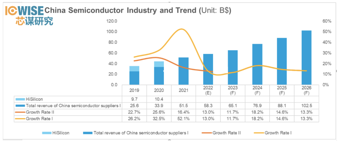 2021 年,中国大陆芯片设计业(包括 Fabless 和 IDM)总销售额首次超过 500 亿美元,达到 515.41 亿美元(不包括矿机芯片),同比增长 16.4%。2021 年增速相比之前几年放缓,主要因为未计入海思当年营收。如果 2020 年也不计海思的营收,2021 年增速则高达 52.1%。中国半导体产业持续保持高速增长,预计 2026 年中国芯片设计业营收将超过 1000 亿美元。
