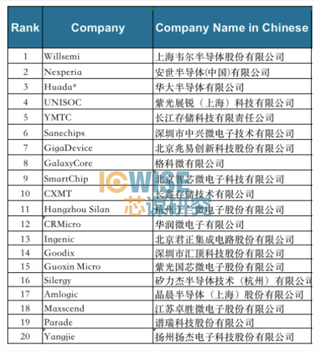 图 2021 年中国前 20 大芯片公司(Fabless + IDM)