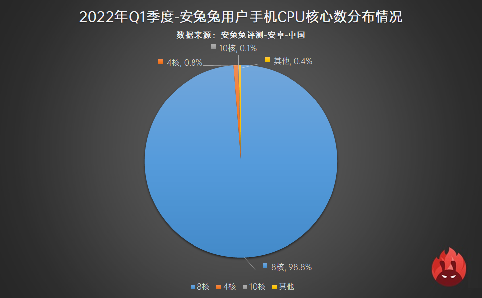 从分布图来看,采用八核心的处理器占比为98%,其中包含高通、联发科、海思等多个品牌,而十核和四核应该是一些用户的备用机,基本是还没退役的老机型,和上个季度基本相同。