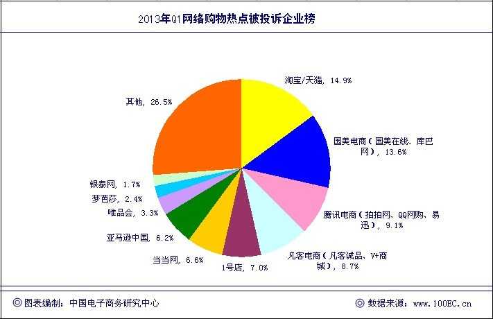 根据中国电子商务投诉与维权公共服务平台对2013年度Q1全国电子商务用户的反馈信息,统计总结出包括淘宝/天猫、国美电商(国美在线、库巴网)、腾讯电商(拍拍网、QQ网购、易迅网)、凡客诚品(包括凡客自营电商部分以及V+商城)、1号店、当当网、亚马逊中国、唯品会、梦芭莎、银泰网在内的“十大网络购物热点被投诉企业”。