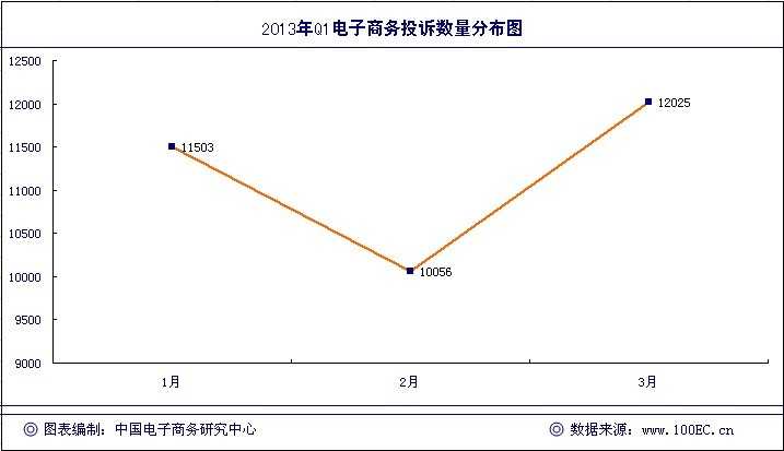 图表显示:2013年Q1,电子商务投诉在二月份有一个回落过程,1月投诉为11503起,2月投诉为10056起,3月投诉为12025起。一月份由于之前的圣诞节、元旦等节日以及双十一遗留的货未收到、售后等问题,导致投诉量也呈增长趋势。二月份正值中国农历新年,并且快递停运等因素,网络购物热度有所下降,故投诉相对较少。三月份由于“3.15消费者维权日”的影响,广大消费维权意识增强,纷纷反馈电子商务交易中出现的问题,投诉量大增。