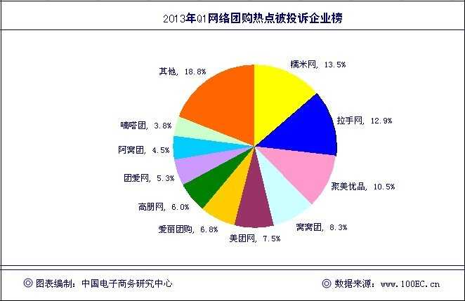 在网络团购领域,投诉依然火热。根据中国电子商务投诉与维权公共服务平台对2013年度Q1全国电子商务用户的反馈数据,统计总结出包括糯米网、拉手网、聚美优品、窝窝团、美团网、爱丽团购、高朋网、团爱网、阿窝团、嘀嗒团在内的“十大网络团购热点被投诉企业”。详见下图: