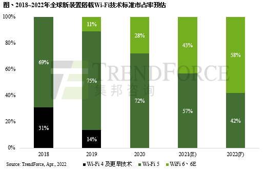 TrendForce集邦咨询进一步表示,2022年Wi-Fi 6、6E市占率将达58%,正式超越Wi-Fi 5技术。主要受各国如美、英、德、法、韩、日等已将6GHz频段用于Wi-Fi技术,以及iOS、Android两大手机阵营支援搭载与相关产业链积极布局所带动。