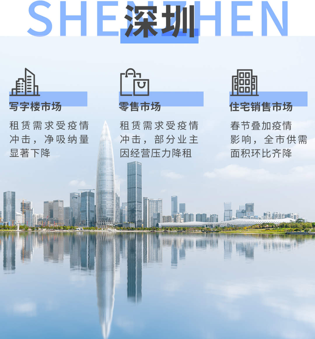 第一季度,本地疫情反复给深圳房地产市场带来一定挑战。写字楼租赁需求放缓,净吸纳量显著下降;防疫措施升级致使部分零售项目经营承压,全市平均租金小幅下调;住宅市场方面,受春节假期及疫情影响,购房者看房活动多有推迟,全市成交面积环比下降。