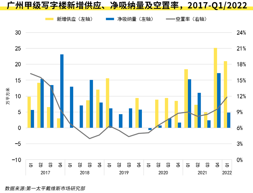 第一季度,广州甲级写字楼租赁市场整体表现相对平淡,全市季度净吸纳量环比下降71.8%,至4.9万平方米。受此影响,叠加季内逾20万平方米新增供应的入市,全市平均空置率自2017年第三季度后再次突破10%,季末录得11.8%,环比上升2.3个百分点。