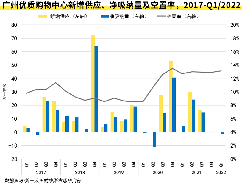 第一季度,租赁需求受本地疫情冲击有所放缓,加之三月市场因疫情原因接近停滞,全市季度净吸纳量环比下降82.8%,录得7.6万平方米。受此影响,全市平均空置率在连续四个季度下降后再次环比微升0.1个百分点,至22.8%。