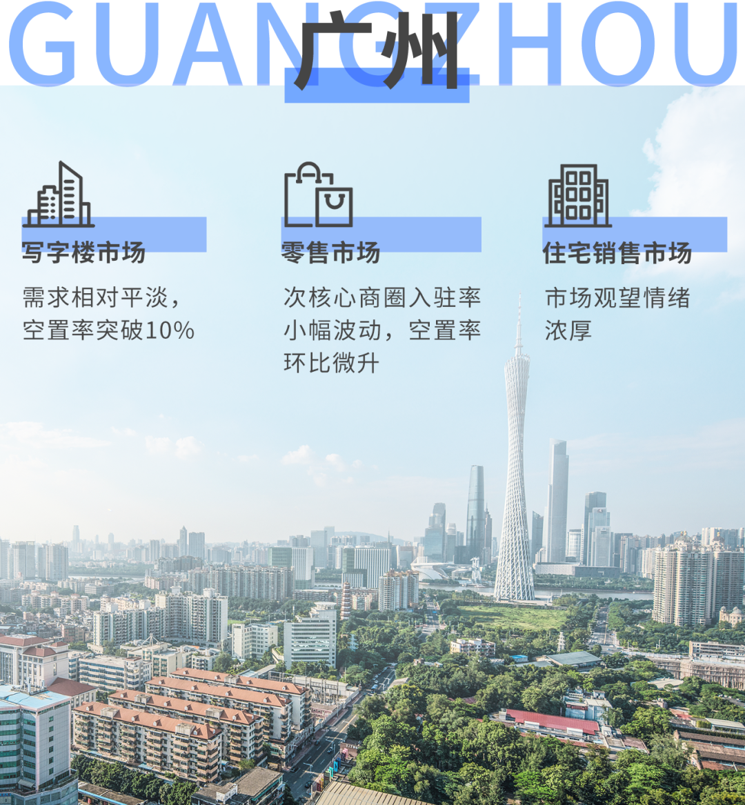 第一季度,广州房地产市场整体表现较为平淡。甲级写字楼租赁需求放缓,全市空置率升至双位数水平;零星疫情影响下,次核心商圈空置率普遍小幅波动上升;住宅市场观望情绪持续浓厚,全市成交面积环同比齐降。