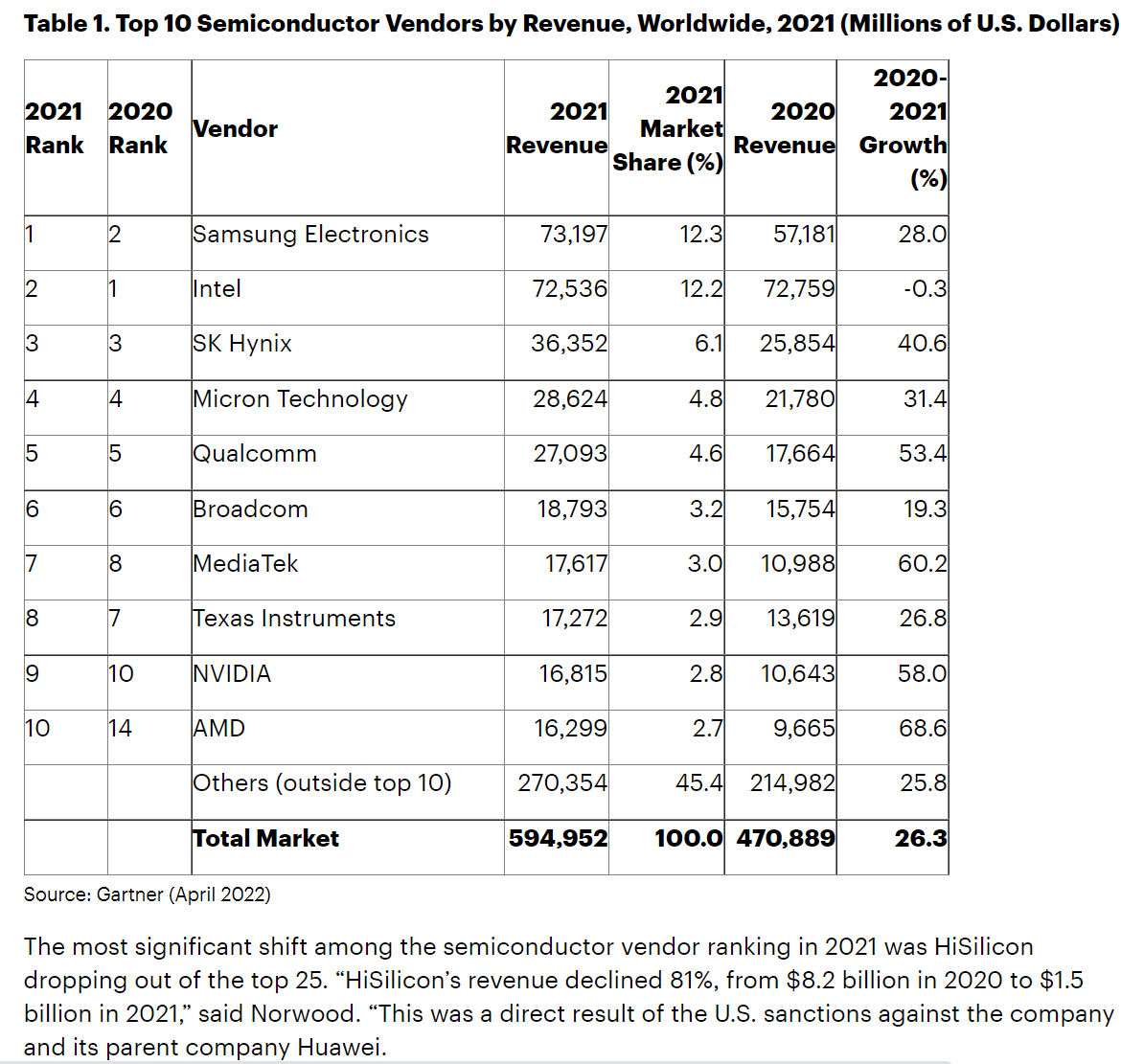 2021年半导体供应商排名中最显著的变化是海思跌出前25名。这是美国制裁该公司及其母公司华为的直接结果。Norwood补充说:“海思的收入下降了81%,从2020年的82亿美元下降到2021年的15亿美元。这也影响了中国在半导体市场的份额,从2020年的6.7%下降到2021年的6.5%。韩国在2021年的市场份额增幅最大,因为内存市场的强劲增长推动韩国获得19.3%的全球半导体市场。”
