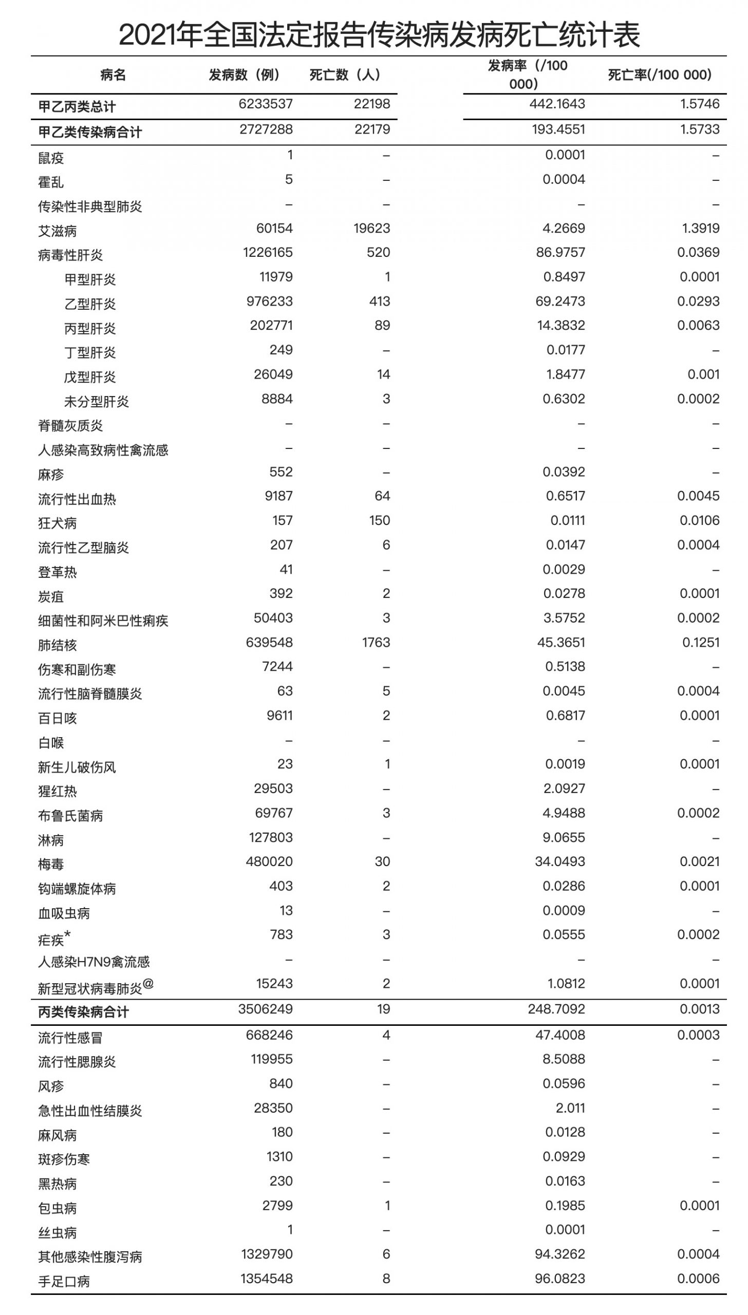 2021年(2021年1月1日0时至12月31日24时),全国(不含香港、澳门特别行政区和台湾地区,下同)共报告法定传染病6233537例,死亡22198人,报告发病率为442.16/10万,报告死亡率为1.57/10万。
