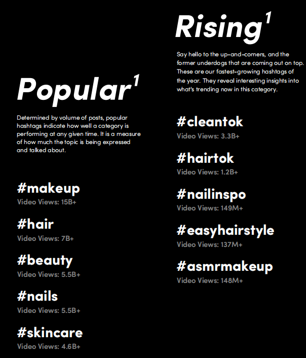 较受欢迎的话题包括用户喜欢的文章、发型教程和产品评论。护发作为主角独得宠爱。同时,护发不仅仅限于美容秘诀,而且我们也看到了很多实验性内容,激励着TikTok用户做真实的自己,并释放创造力。除了护发,指甲护理和香水这两大品类也很受欢迎。