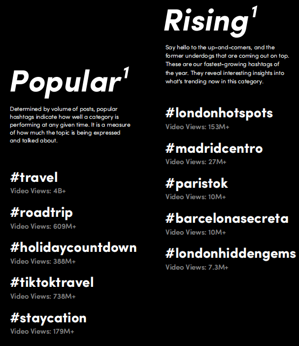 (过去一年TikTok欧洲站旅游类热门话题及播放量)