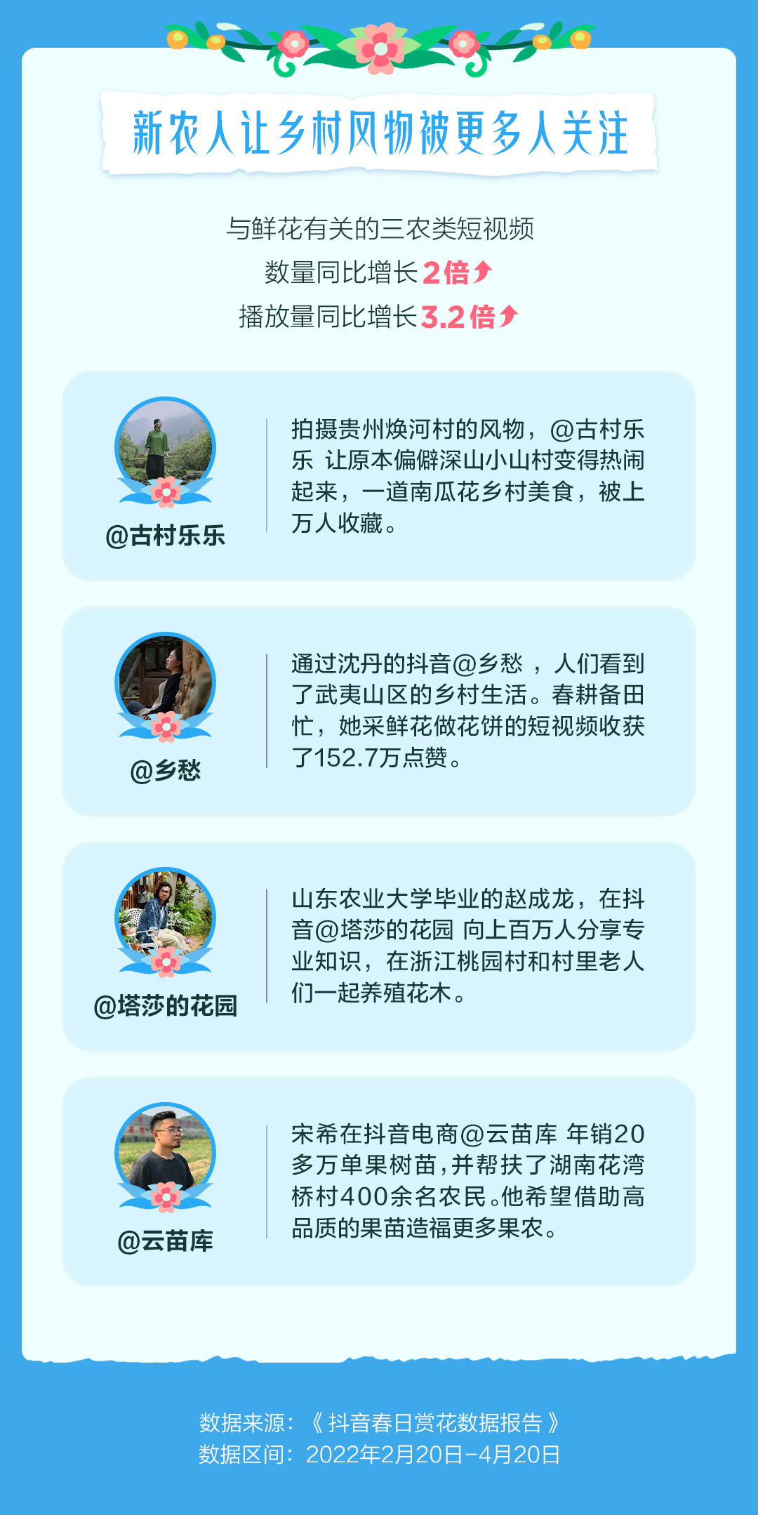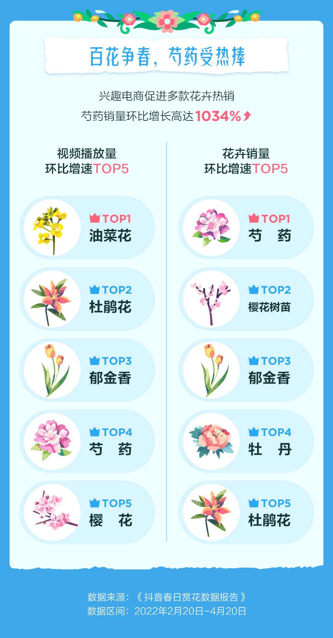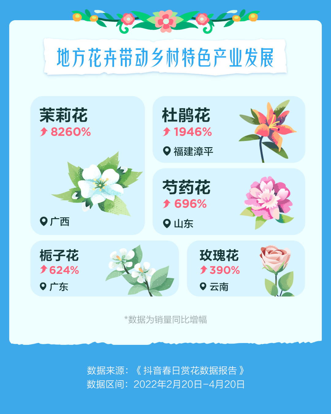 报告显示,2月20日到4月20日期间,在短视频和直播“云赏花”内容的带动下,抖音电商花卉绿植销量环比增幅达153%,广西茉莉、山东芍药等区域特色商品销量成倍增长,助力地方乡村花卉产业不断发展。