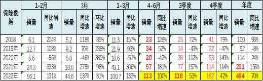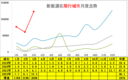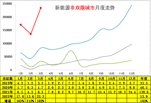 2022 年新能源车在非双限城市的表现极其优秀,1 月份销售 17 万台增速很强,2 月增速达到 212%,3 月份销售 23.3 万台,增速 182%,3 月高于 1 月增速的表现很好。总体来看,1-3 月份累计达到 54 万台水平,同比增长 183%,呈现了强势增长特征。