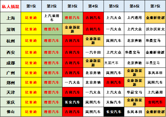 私人插混市场的比亚迪和理想汽车的表现较强,尤其是比亚迪的主力城市几乎全面领先。理想汽车在北京、郑州、重庆等表现很好。上汽乘用车也是走势较强。