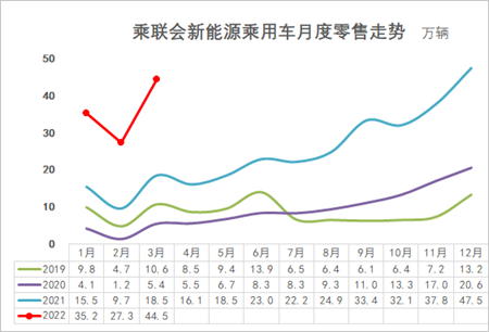 2021 年新能源乘用车零售 299 万辆,同比增长 170%,2022 年 1-3 月达到 113 万,同比增长 145%,增速依旧保持高位。2022 年 3 月新能源乘用车国内零售销量远超 1 月销量的走势,体现持续需求走强的良好趋势。