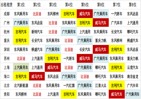 各地出租市场的表现相对差异化较大。今年 3 月表现较强的出租市场是成都、广州、杭州、重庆、深圳、上海、长沙、海口、贵阳等,其中各个厂家在各地的出租市场表现也是差异较大。有些地区的本地产品在本地出租市场的占有率并不一定很高,比如深圳市场,还有重庆市场今年都是外地品牌表现相对优秀。