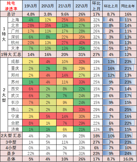 目前看限购城市的纯电动车占比大幅提升,从 2019 年的 14% 上升到 2022 年的 31%,而非限购城市中的大型城市、中型城市和小型城市的新能源车的纯电动车的销量占比基本相同,2019 年和 2020 年都在偏低的水平。今年中等城市的 3 月上升到 33%,县乡市场的渗透表现也是较强。
