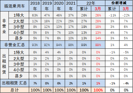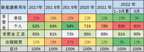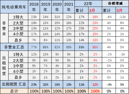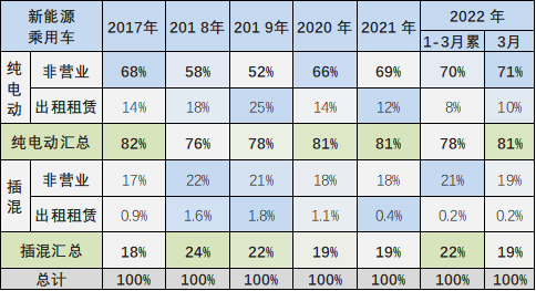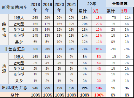 纯电动车的租赁市场目前表现逐步的回暖,2019 年出租租赁占纯电动车销量 32%,2020 年出租租赁的占比达到 18%,2022 年 3 月表现下降到 10% 左右水平。