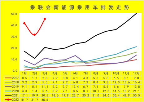 3 月新能源乘用车批发销量达到 45.5 万辆,同比增长 122.4%。历年新能源车的走势在年初相对低迷逐步拉升,2021 年 1-3 月新能源起步较强,且 5-12 月持续走强。由于今年疫情下,新能源车需求太旺,因此 3 月走势依旧很强。