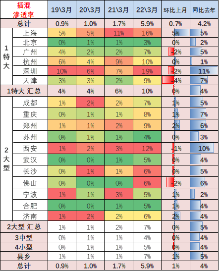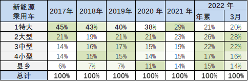 新能源乘用车前几年主要在限购特大城市需求较强,近期持续下行。2022 年 3 月新能源乘用车在特大城市,占到总销量 20%,较 2021 年下降 9 个百分点,这也是说明限购城市的新能源车市场销量逐步稳定,限购对需求有约束。近期的县乡市场新能源逐步启动。