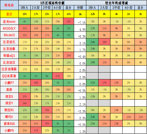从主力车型的表现来看,体现了主力车型在大中城市表现的改善,尤其是以五菱宏光 MINI 为代表的增量,3 月相比较同期的份额增量是小城市和县乡市场增长 1 个百分点。从特斯拉毛豆 3 来看,3 月份的份额下降主要是特大城市,也就是前期上海的增量的贡献度很大,其它地方的市场相对较好。