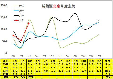 北京市场 2022 年新能源车市场走势相对较平稳,2022 年 3 月销量达到 1.3 万台,但 2022 年 1 月北京销量低于去年较多,2 月的新能源车销量达到 0.54 万台,1-3 月的累计销量同比增长 28% 的表现一般。