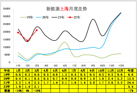 2022 年 3 月份上海的新能源车市场销量达到 2.1 万台,相对去年 3 月的 2.3 万下降不大,下月的上海新能源车遭遇疫情损失较大。