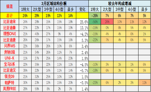 3 月相对同期的插混走强,限购城市仍是插混主力,非限购城市需求尚未全面有效推动。奔驰 E、长安 uni-k、领克 09 等限购城市依赖度较高。比亚迪插混在中小城市的表现较强。