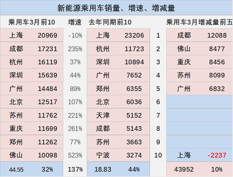 3 月的新能源车增长主力是西安和成都等非限购大城市,限购的深圳、广州、杭州等限购表现较强,但上海和北京的增量较小。目前的市场增量在成都、合肥等大城市。限购城市表现分化,目前北京等特色区域推广地区下降较大。