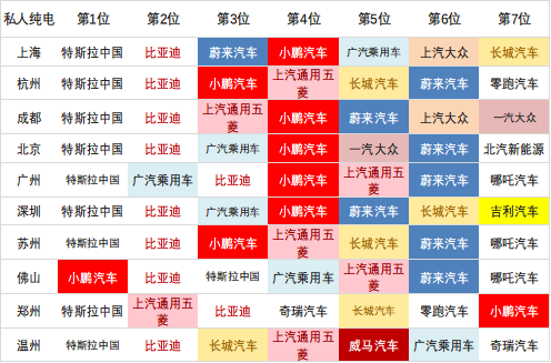 私人纯电动市场的特色相对鲜明,高端化趋势极其明显。特斯拉表现相对较强,除了佛山都是第一。比亚迪表现优秀,除了广州和郑州外基本都是第二。天津是天津市的长城,郑州的上汽通用五菱,其它地区大部分都是高端化的。