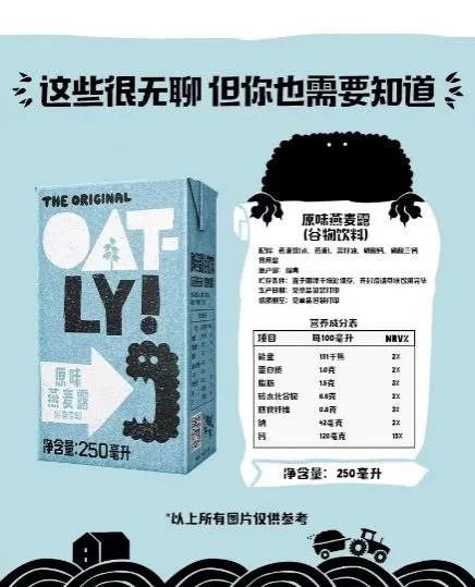 OATLY 在传递符号时,使用了很多手段,其中一个有趣的细节就是它看似 “胡闹” 的包装。在 OATLY 的包装上,正面印着富有典型北欧风格的手绘涂鸦,而在产品成分表和规格的一侧则印上了 “这些很无聊,但你也需要知道” 字样。这些充满创意的差异化内容,打破了传统饮品包装的套路,令人会心一笑。