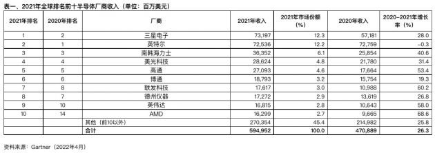三星电子自2018年以来首次超越英特尔重回第一,尽管领先优势还不到1%,该公司在2021年的收入增长了28%。英特尔的收入下降了0.3%,市场份额为12.2%,相较于三星的12.3%。在排名前十的半导体厂商中,2021年内增长最快的是AMD和联发科技,两家公司在2021年分别增长了68.6%和60.2%。