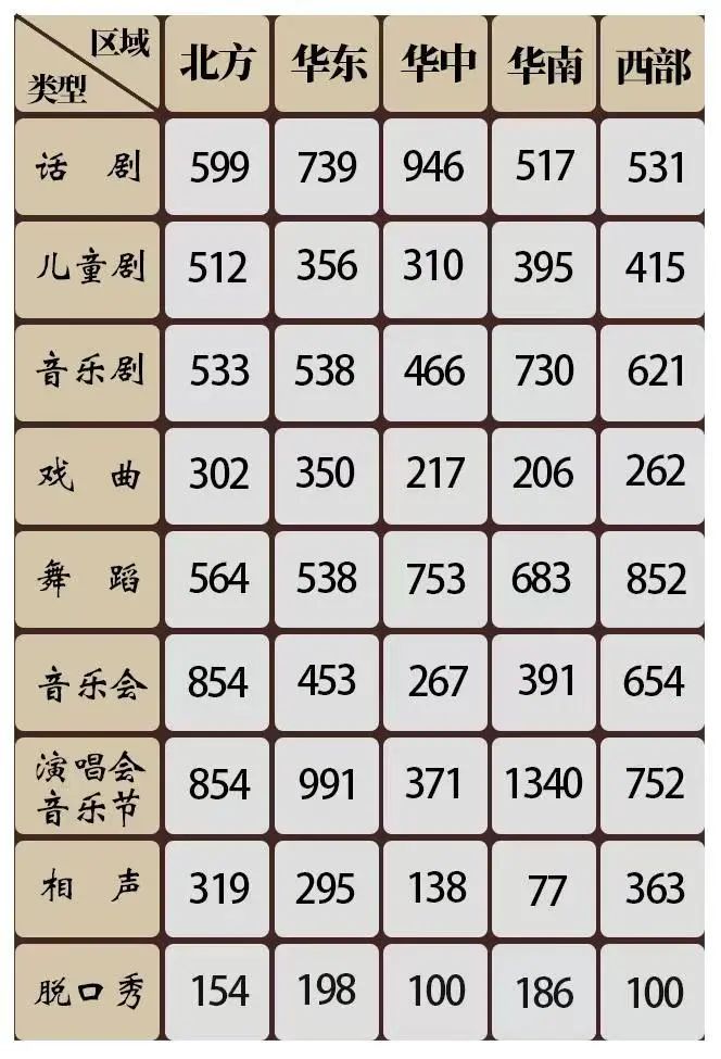 报告以行业数据为基准,以企业调研为补充,全貌呈现北部、华东、华中、华南、西部不同区域演出市场表现及演出产品需求潜力,并基于业内主要票务系统和剧场上报数据,对包括话剧、音乐剧、儿童剧、戏曲、舞蹈、音乐会、演唱会和音乐节、相声、脱口秀在内的主要艺术门类市场分类盘点。