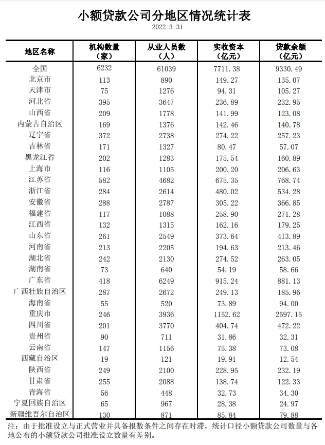 中国人民银行:2022年第一季度小额贷款公司贷款余额为9330亿元 减少85亿元 2022年一季度小额贷款公司统计数据报告 截至2022年3月末,全国共有小额贷款公司6232家。贷款余额9330亿元,一季度减少85亿元。 附表: 更多阅读:中国人民银行:2019年第一季度城镇储户问卷调查报告中国人民银行:安徽省金融运行报告(2022)中国人民银行:2023年第一季度企业家问卷调查中国人民银行:2019年第一季度企业家问卷调查报告中国人民银行:2023年二季度小额贷款公司统计数据报告中国人民银行:2023年6月份金融市场运行情况中国人民银行:2023年一季度金融统计数据中国人民银行:2024年第二季度中国货币政策执行报告中国人民银行:2024年4月份金融市场运行情况中国人民银行:2023年8月金融统计数据报告中国人民银行:2023年7月份金融市场运行情况中国人民银行:2023年4月份金融市场运行情况中国人民银行:2023年第一季度中国货币政策执行报告中国人民银行:2023年4月金融统计数据中国人民银行:2023年3月份金融市场运行情况